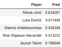 Above are the top-5 finishers in predicted vote share for the 2024 award. 2023-24 came with new criteria imposed on players to be eligible for awards. Players must have played at least 20 minutes in at least 65 games, allowing for only two “near-misses” where they played 15-19 minutes. I instilled these restrictions on my predictions even though they removed Joel Embiid from contention and I was interested to see where his injury-marred season would stack up. From 5-1 here are the predicted MVP candidates;