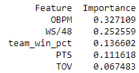 Offensive Box Plus-Minus (OBPM) is a box score-based metric that measures a basketball player's offensive contribution in terms of points per 100 possessions. OBPM extends beyond traditional stats like points per game by accounting for a player's efficiency and overall offensive impact while they are on the court. OBPM is particularly relevant to MVP discussions because it isolates the offensive aspect of a player’s game, which MVP voters tend to regard more highly than defensive performance. A high OBPM indicates that a player is not only scoring but doing so efficiently and in ways that significantly boost their team's offensive output. Win Shares per 48 minutes (WS/48) is a stat which attempts to measure how many wins a player contributes to their team. Higher WS/48 values suggest that a player is not just accumulating statistics, but doing so in a way that significantly enhances their team's ability to win games. Given that MVP voters often favor players who lead successful teams, this metric is understandably instrumental. It reflects not just performance but impactful performance. Having these two advanced metrics as the two most important features shows how comprehensive one-number analytics can be helpful in assessing players. Features three through five are much more straightforward; team win percentage, points per game, and turnovers per game. Now that the model is fully operational we can check how it performed on past seasons and predict the 2023-24 NBA MVP.